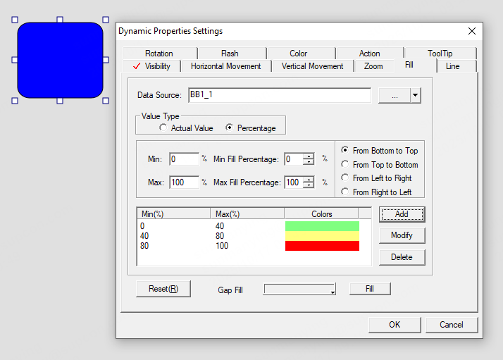 When the data source tag "BB1_1" is between 0-40, the graphic object's background is blue, and 0-40% of its area is filled green.