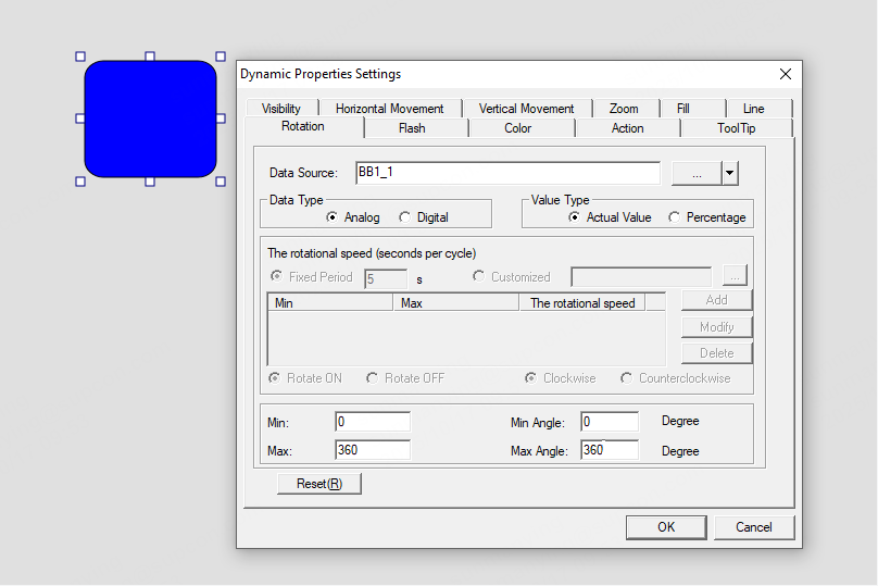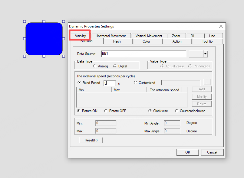 Discrete Value: When the data source tag "BB1" is 1, the blue graphic rotates at a speed of 5 seconds/cycle.