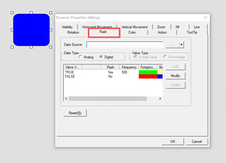 Discrete Value: When the data source tag "BB1" is 1, the blue graphic is visible in runtime mode. When the data source tag "BB1" is 0, the blue graphic is not visible in runtime mode.