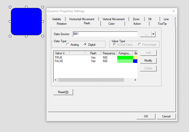 Analog Value: When the data source tag "BB1" is between 0-50, the blue graphic is visible in runtime mode. When the data source tag "BB1" is between 50-100, the blue graphic is not visible in runtime mode.